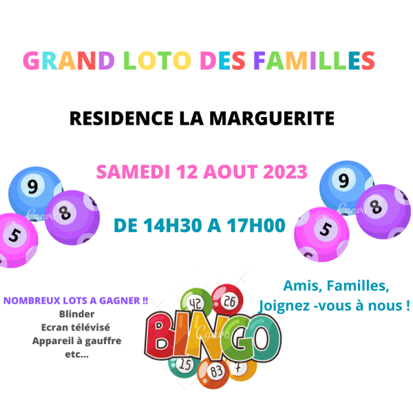La résidence La Marguerite vous convie à participer au Grand Loto des Familles le samedi 12 Aout de 14h30 à17h00 !