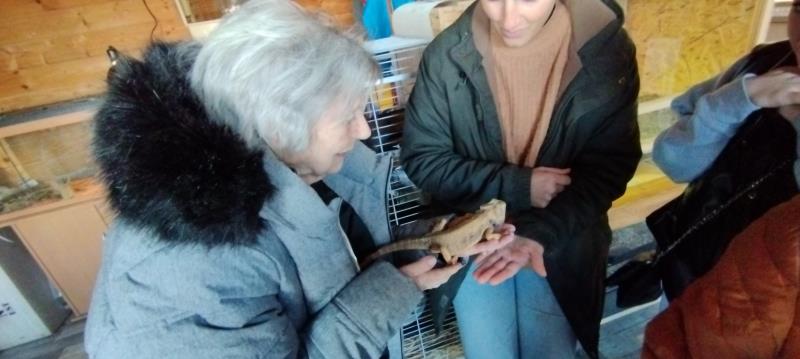 Chaque semaine, quatre de nos résidents vont à la rencontre des animaux de la ferme : moutons,chèvres, poules, canards ...mais aussi des animaux plus insolites : rats sans poils, serpents......